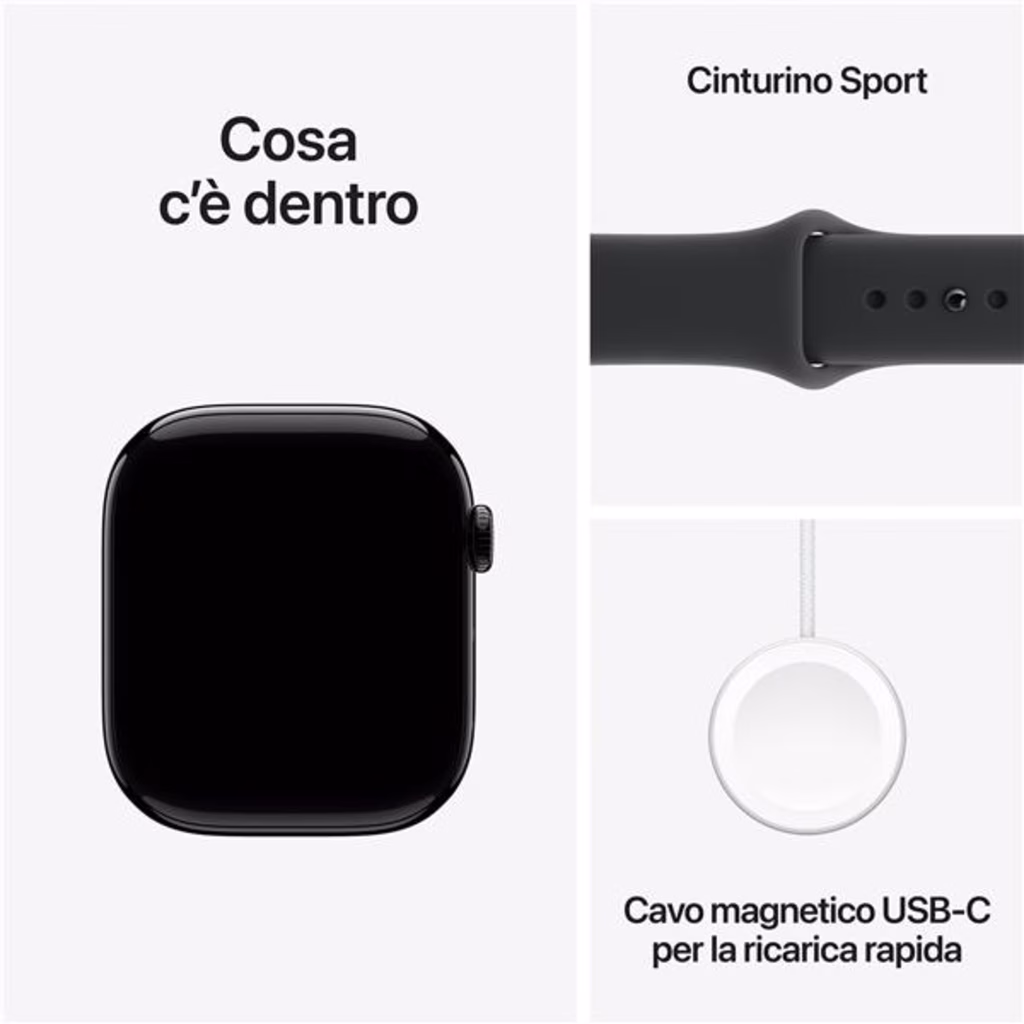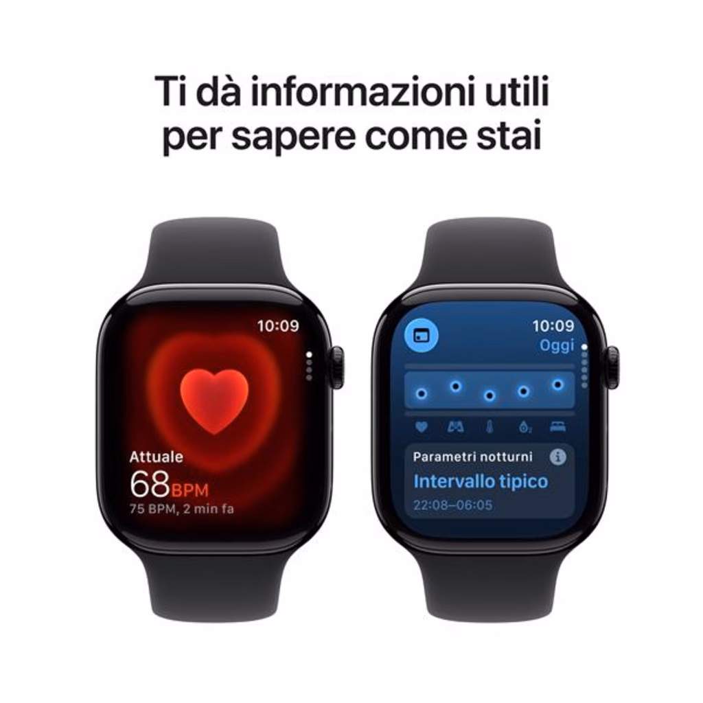 Apple Watch Series 11 GPS 46mm Cassa Alluminio Jet Black con Sport Band Nero - M/LRicevi informazioni preziose sulla tua salute Apple Watch Series 11 ti offre informazioni preziose sulla tua salute, con notifiche in caso di frequenza cardiaca troppo alta o troppo bassa e dati sulla qualità del sonno. Migliora la tua forma fisica con parametri evoluti per tutti i tuoi allenamenti. E goditi fino a 24 ore di batteria. Caratteristiche principali - QUALITÀ DEL SONNO Un nuovo parametro che ti aiuta a controllare come dormi e a riposarti meglio. - ANCORA PIÙ INFORMAZIONI SULLA TUA SALUTE Ricevi notifiche se la frequenza cardiaca è troppo alta o troppo bassa, accedi ai dati sanitari raccolti mentre dormi nell app Parametri Vitali e misura il livello di ossigeno nel sangue. - DESIGN SPETTACOLARE Sottile e leggero, Series 11 è comodo da indossare tutto il giorno e anche mentre dormi, così puoi monitorare i tuoi parametri vitali 24 ore su 24. - IL TUO COMPAGNO DI FITNESS IDEALE Parametri evoluti per tutti i tuoi allenamenti, funzioni come Ritmo definito, Zone di frequenza cardiaca e Carico di allenamento, e molto altro. In più, con Series 11 hai tre mesi gratis di Apple Fitness+. - TANTA AUTONOMIA IN PIÙ Fino a 24 ore di utilizzo normale.1 E ricarica rapida per avere fino a 8 ore di utilizzo normale in soli 15 minuti. - FATTO PER DURARE Display ultrarobusto con vetro due volte più resistente ai graffi rispetto a Series 10. Resistenza all acqua fino a 50 m e resistenza alla polvere di grado IP6X. - FUNZIONI PER LA SICUREZZA Se hai avuto una brutta caduta o un grave incidente d auto, Series 11 può accorgersene, aiutarti a chiamare i soccorsi e inviare una notifica ai tuoi contatti di emergenza. Invece, la funzione Tutto bene , può automaticamente avvisare una persona cara appena arrivi a destinazione. - SEMPRE IN CONTATTO Manda messaggi, rispondi a una chiamata, ascolta musica, usa Siri e leggi le notifiche. Insieme al tuo iPhone o sotto rete Wi-Fi, Series 11 (GPS) ti tiene in contatto col mondo.Il massimo per una vita più sana.Apple Watch può fare cose che gli altri dispositivi nemmeno si sognano, perché è sempre con te. Quando lo indossi, hai subito dati utili sulla salute, un compagno di fitness che misura ogni tuo movimento, funzioni per la sicurezza, e un sacco di modi per rimanere in contatto con le persone e le cose a cui tieni.SaluteBuonanotte. Sarà un buon giorno.