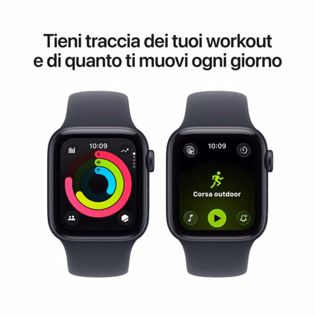 Apple Watch SE (3nd generation) SE 3 GPS 40mm Cassa Alluminio Mezzanotte con Sport Band Mezzanotte - S/MTi motiva, ti connette, ti informa. Ti piace. Con Apple Watch SE 3 hai il parametro Qualità del sonno , il display always-on, gli anelli Attività e tante altre funzioni essenziali. A un prezzo ancora più conveniente. Con Apple Watch SE 3 hai tante funzioni essenziali per la salute, il fitness, la connettività e la sicurezza, a un prezzo ancora più conveniente. Monitora la qualità del sonno. Ottieni più informazioni sulla tua salute con l app Parametri Vitali. Resta in forma scegliendo fra tanti allenamenti diversi. Ricarica a tutta velocità. Tieni sempre sott occhio le informazioni di base grazie al display always-on. Il tutto con un giorno intero di autonomia: la batteria dura fino a 18 ore. Caratteristiche principali - FUNZIONI ESSENZIALI PER LA SALUTE Grazie al sensore di temperatura, hai più informazioni sulla tua salute nell app Parametri Vitali. Inoltre, ricevi anche un riassunto giornaliero sulla qualità del sonno e notifiche in caso di frequenza cardiaca troppo alta o troppo bassa. - L AUTONOMIA CHE CERCAVI La batteria dura 18 ore, praticamente tutto il giorno. E la ricarica è fino al doppio più veloce rispetto a SE 2: bastano 15 minuti per avere fino a 8 ore di autonomia.2 - DISPLAY ALWAYS-ON Adesso puoi leggere l ora e vedere il quadrante senza bisogno di sollevare il polso per riattivare il display. - IL TUO COMPAGNO DI FITNESS SE 3 ti offre tanti modi per tenere traccia di ogni tuo allenamento. E i parametri in tempo reale ti aiutano a raggiungere i tuoi obiettivi come non mai. - SEMPRE IN CONTATTO Manda messaggi, rispondi a una chiamata, ascolta musica e podcast, usa Siri e leggi le notifiche. Insieme al tuo iPhone o sotto rete Wi-Fi, SE 3 (GPS) ti tiene in contatto col mondo. - FUNZIONI PER LA SICUREZZA Se hai avuto una brutta caduta o un grave incidente d auto, SE 3 può accorgersene, aiutarti a chiamare i soccorsi e inviare una notifica ai tuoi contatti di emergenza. Invece, la funzione Tutto bene , può automaticamente avvisare una persona cara appena arrivi a destinazione. - IL TUO OROLOGIO, IL LOOK CHE VUOI TU Scegli fra decine di quadranti da personalizzare come vuoi, e tra un infinità di cinturini con colori, stili e materiali diversi. Il massimo per una vita più sana.Apple Watch può fare cose che gli altri dispositivi nemmeno si sognano, perché è sempre con te. Quando lo indossi, hai subito dati utili sulla salute, un compagno di fitness che misura ogni tuo movimento, funzioni per la sicurezza, e un sacco di modi per rimanere in contatto con le persone e le cose a cui tieni.SaluteBuonanotte. Sarà un buon giorno.