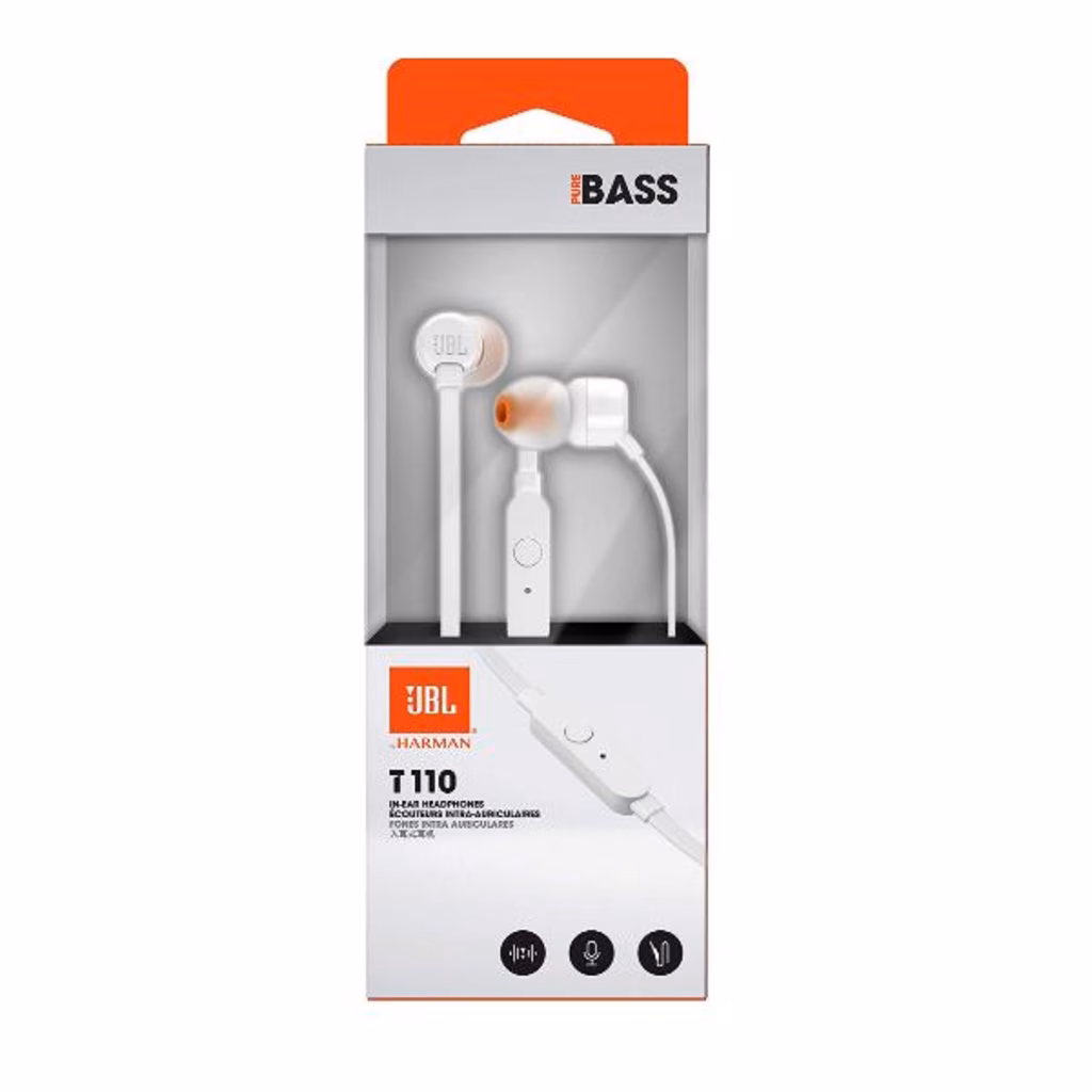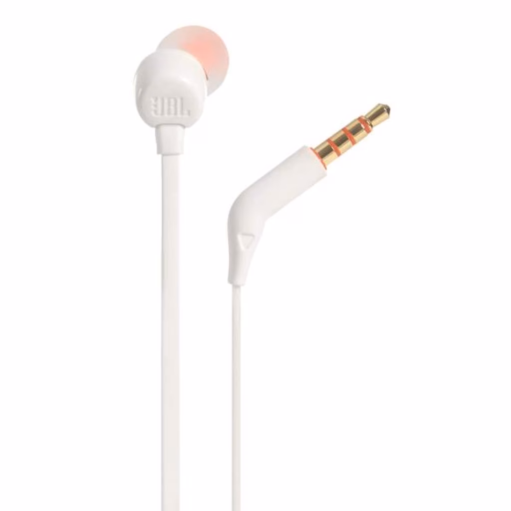 Ecco le cuffie intra-auricolari JBL T110. Sono leggere, comode e compatte. Dentro il resistente corpo degli auricolari, una coppia di driver da 9 mm riproduce bassi profondi, emettendo il suono JBL Pure Bass che hai ascoltato nelle sale da concerto, negli stadi e negli studi di registrazione in tutto il mondo.