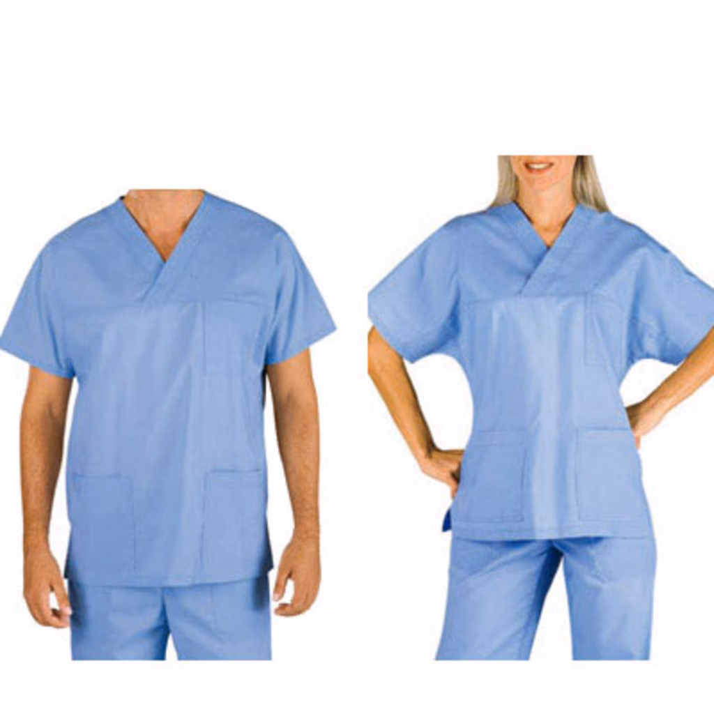 Casacca unisex a mezze maniche - realizzata in cotone 100% - collo a" V" - 2 tasche anteriori - 1 taschino al petto - cuciture rinforzate nei punti di maggior sforzo e realizzate in robusto ed idoneo filato - ideale nel campo infermieristico e ospedaliero - tessuto da g/mq 185 - colore celeste - taglia XL