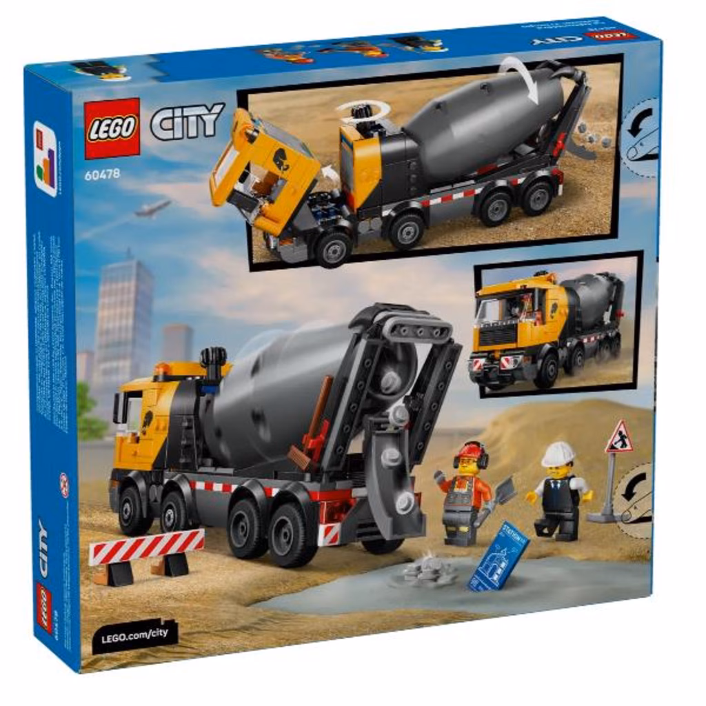 I fan dei giocattoli di cantiere adoreranno il kit di costruzione del modello Betoniera LEGO® City (60478) per i bambini dai 7 anni in su. Questa dettagliata betoniera con 8 pneumatici in gomma è dotata di un grande tamburo con sistema a vite di Archimede. I bambini possono ruotare una manopola per mescolare e versare il cemento LEGO sulla condotta di scarico regolabile, proprio come nella realtà. Questo grande camion giocattolo è anche dotato di cabina di guida inclinabile per consentire l accesso al motore. Gli accessori includono una carriola, segnaletica stradale e 2 barriere, oltre alle minifigure del conducente, dell operaio edile e dell architetto per il gioco creativo. Questo modello di camion costruibile LEGO City per bambini è un fantastico regalo di compleanno o di Natale per i bambini e le bambine di 7 anni che amano i veicoli da cantiere. Aggiungi questo set agli altri della gamma LEGO® City (disponibili separatamente) per avventure ancora più grandi. I bambini possono divertirsi a costruire in modo intuitivo con questo playset con veicolo giocattolo nell app LEGO Builder, ingrandendo e ruotando con le istruzioni 3D, e salvando e tenendo traccia dei progressi.