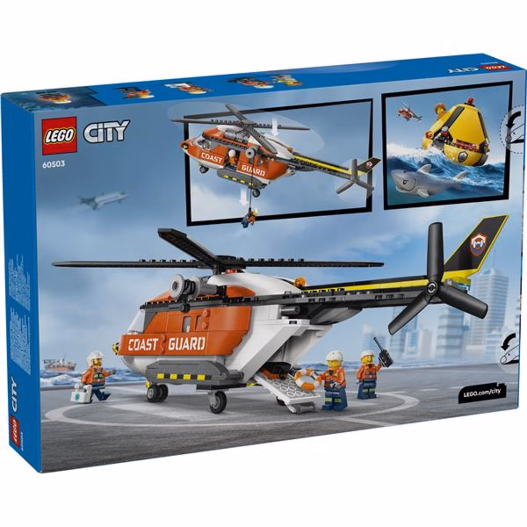Questo set costruibile dell Elicottero della Guardia Costiera LEGO® City (60503) è ricco di dettagli autentici per gli appassionati di giochi di finzione e veicoli di emergenza. L imponente modello di elicottero rosso è dotato di rotori girevoli, sportelli laterali scorrevoli, rampa posteriore apribile, cabina di pilotaggio dettagliata e fusoliera. I bambini possono abbassare un membro dell equipaggio con il verricello dell elicottero e il set include anche una capsula di salvataggio apribile accessibile al suo interno. Basta aggiungere il pilota, il cittadino, 2 guardie costiere e lo squalo per ore di gioco di fantasia. Questo dettagliato set costruibile è un regalo divertente per i bambini di 7 anni che amano il gioco LEGO ricco di azione. Aggiungilo ad altri set LEGO City (disponibili separatamente) per avventure ancora più grandi. I bambini possono aumentare il divertimento con questo set Elicottero della Guardia Costiera LEGO nell app LEGO Builder, dove possono ingrandire e ruotare con le istruzioni 3D, salvando e monitorando i progressi mentre costruiscono.