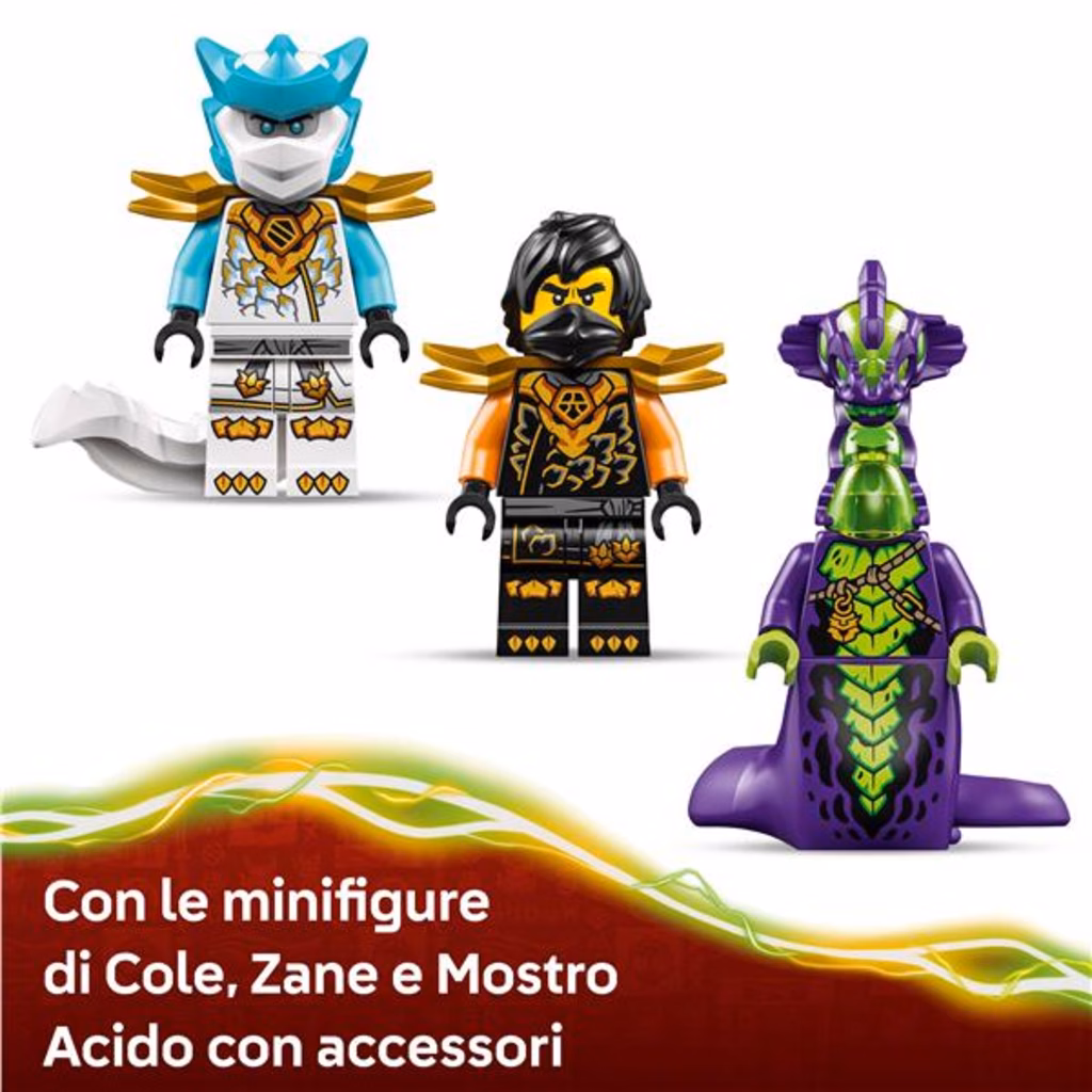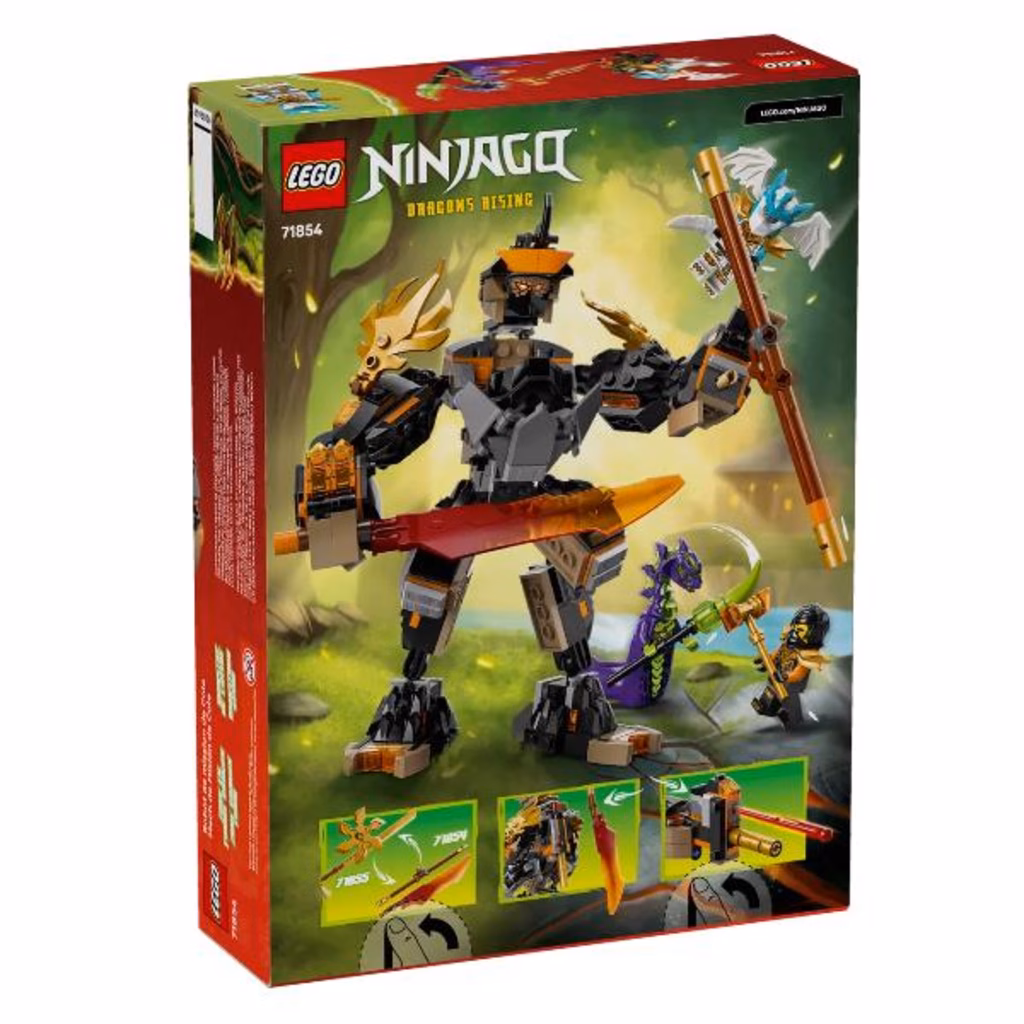 I bambini e le bambine dai 7 anni in su adoreranno costruire questo giocattolo ninja Mech della missione di Cole e drago Zane LEGO® NINJAGO® (71854) e ricreare le scene della stagione 4 dello show televisivo NINJAGO La rivolta dei draghi. Questo playset contiene un mech giocattolo con testa, braccia, spalla, dita, gambe e caviglie snodabili, oltre a un cockpit per posizionare una minifigure al suo interno. Il mech è dotato di 3 armi: una spada, un bastone e un blaster a molla con 2 frecce, chei bambini possono scambiare con le armi del set La battaglia del drago ninja Riyu (71855), disponibile separatamente). Questo giocattolo NINJAGO contiene anche 3 minifigure: Cole con un martello, drago Zane con una spada e un Mostro Acido con un bastone per le battaglie. La gamma di set da costruzione LEGO NINJAGO per i bambini include mech, draghi e templi in modo che i fan possano ricreare l azione ninja. I bambini possono costruire con confidenza utilizzando l app LEGO Builder: ingrandisci,ruota in 3D e tieni traccia dei progressi con istruzioni digitali facili da seguire.