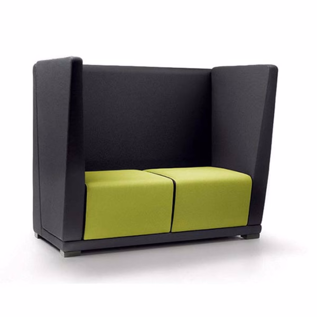 Poltrona con braccioli - Schienale h.110cm - Rivestimento in tessuto Mirage (test. usura 100.000 cicli Martindale) - Due basi L55 cm - Dimensioni LxPxH 134x62x110 - Schiena e braccioli rivestiti con tessuto colore grigio antracite (richiedibile anche in altri colori) - Base rivestita con tessuto colore verde