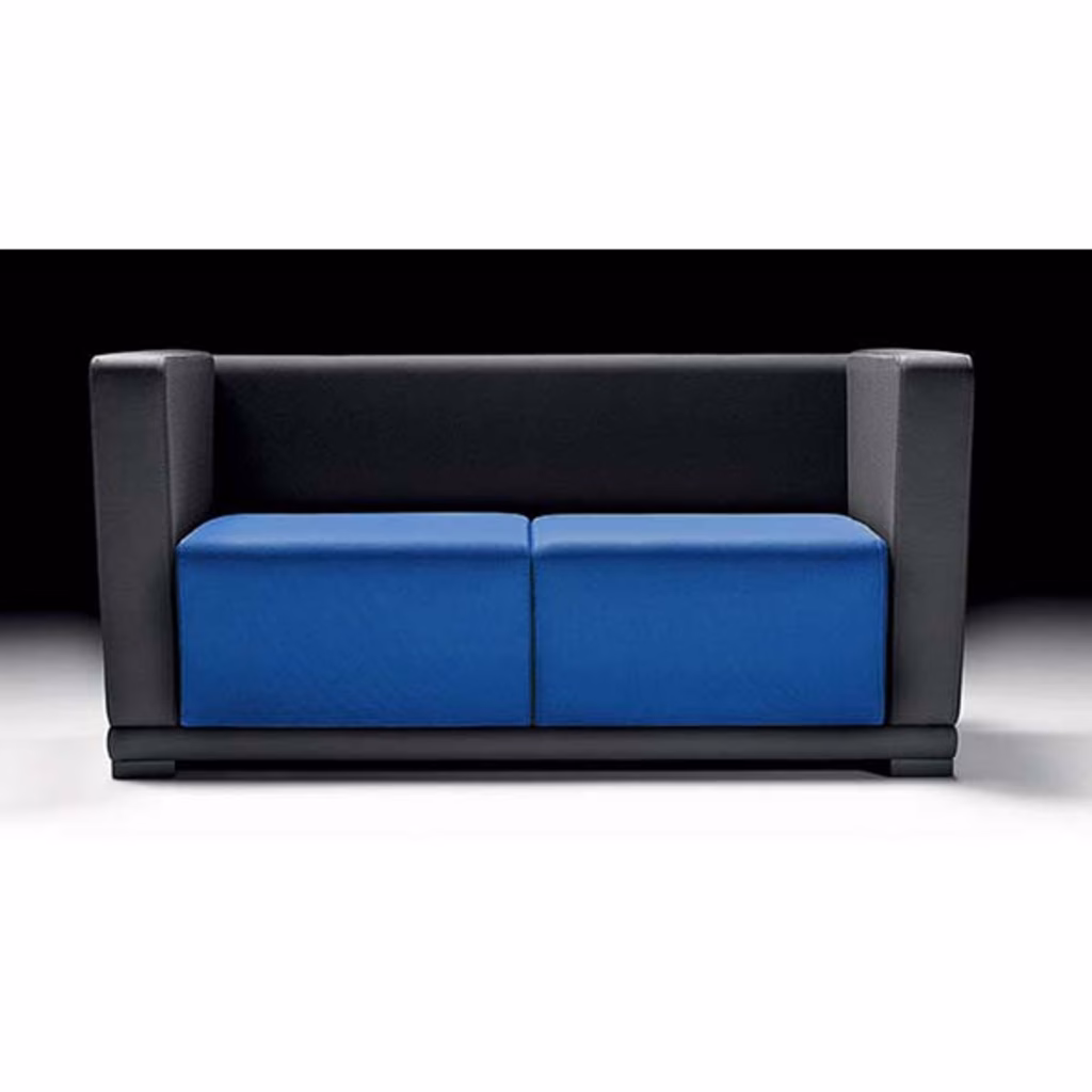 Poltrona con braccioli - Schienale h.73cm - Rivestimento in tessuto Mirage (test. usura 100.000 cicli Martindale) - Base L110 cm. Dimensioni LxPxH 134x62x73 - Schiena e braccioli rivestiti con tessuto colore grigio antracite (richiedibile anche in altri colori) - Base rivestita con tessuto colore blu