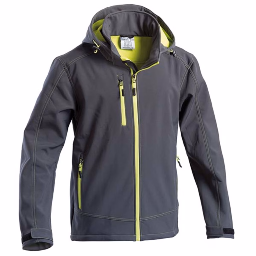 Giacca softshell a 3 strati con zip lunga e cappuccio staccabile - interno giacca, cuciture e cerniere in colore fluo a contrasto - 2 tasche laterali ed 1 tasca al petto chiuse con - 3 tasche interne - polsini regolabili con velcro - coulisse con fermacorda al fondo