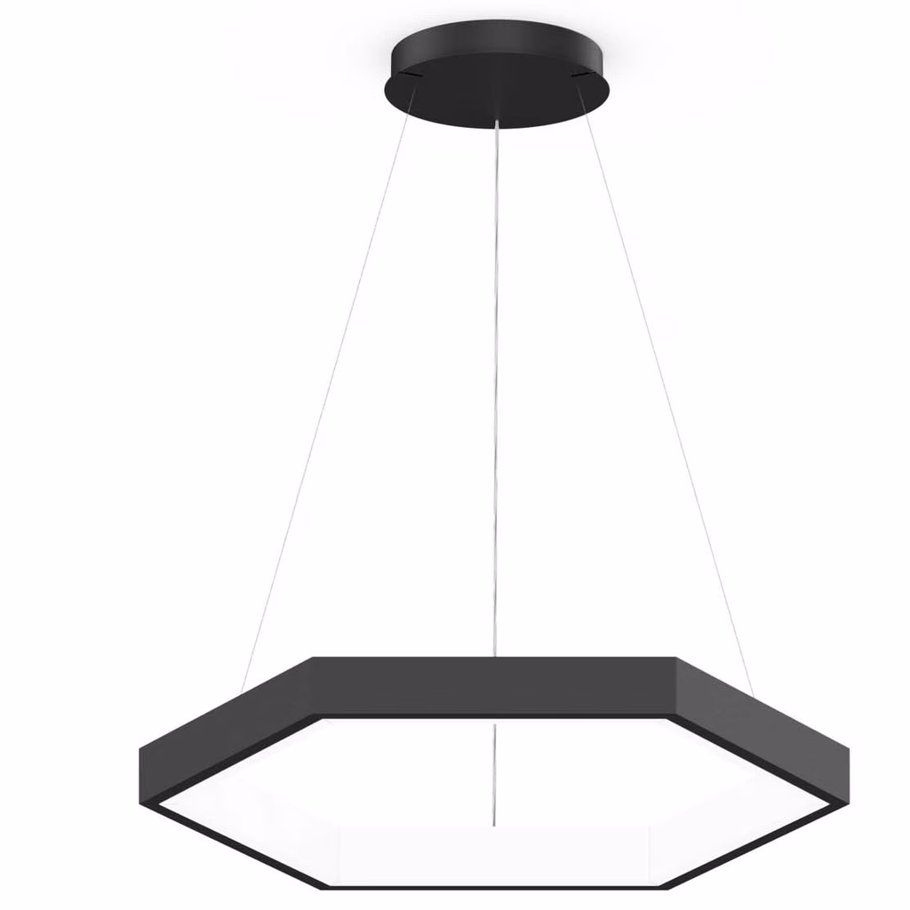 Corpo faro esagonale in alluminio; saldato senza punti di saldatura; superficie verniciata a polveri nero; apparecchio con sospensione a fune da 2000 mm; regolazione altezza senza utensili; incl. cavo di alimentazione trasparente; alimentatore elettronico montato nel rosone; colore della luce 3000 K; binning iniziale  3 MacAdam; CRI  80; 90 % min. del flusso luminoso dopo 50000 h di durata di vita; LED a efficienza energetica con un'elevata resa cromatica; diffusore HPO (High Performance Opal) per unilluminazione omogenea; grazie ad una composizione speciale di materiali con una maggiore trasmissione e diffusione; + 15% di efficienza luminosa rispetto ai normali diffusori opalini; emissione verso linterno; fascio luminoso diretto / indiretto per una illuminazione d'accento del soffitto; rosone copricavo con 2 entrate per il cavo e morsetto per collegamento continuo; grado protezione IP20; classe isolamento 1 220-240V; sicurezza fotobiologica secondo la normativa IEC 62471 gruppo di rischio RG 0 - Rischio esente; cablaggio interno apparecchio senza alogeni; incl. convertitore DALI-2; Diametro 755mm