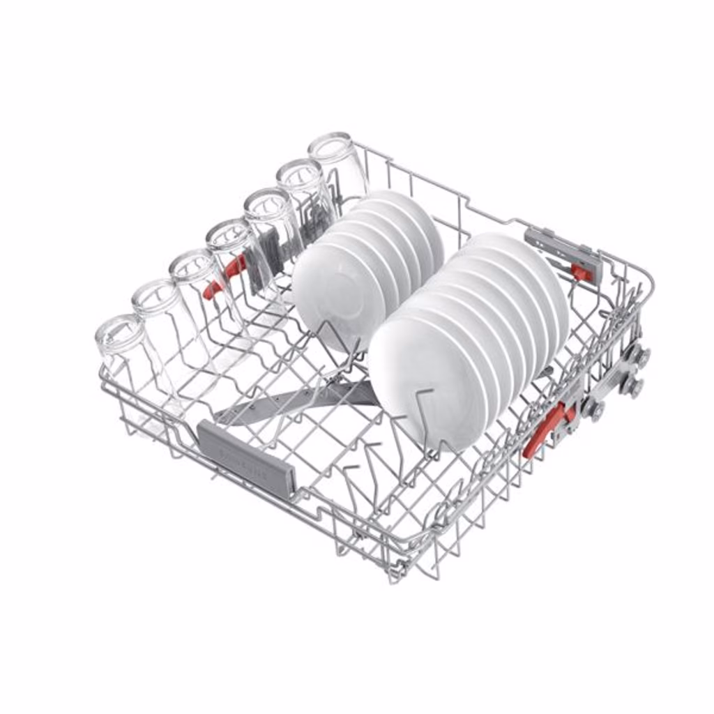 Sistema piatti, tazze e bicchieri in modo più facile e sicuro. I piedini del cestello intermedio possono essere regolati su 3 diverse angolazioni utilizzando unapposita leva, mentre quelli del cestello inferiore si piegano per fare posto a stoviglie di grandi dimensioni. E con lapposito Porta-bicchieri anche gli oggetti più delicati, come i calici, saranno al sicuro.