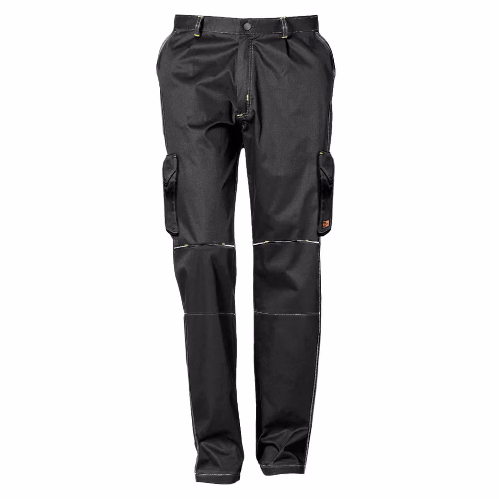 Pantalone stretch cotone 98%/elastane 2% - sei tasche, due laterali chiuse da patta, due ai fianchi, due posteriori con cuciture a contrasto grigie e travette di rinforzo in giallo - profilo rifrangente, ginocchiere preformate, elastico in vita.