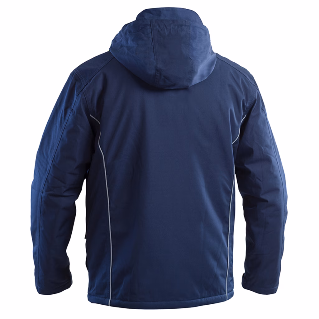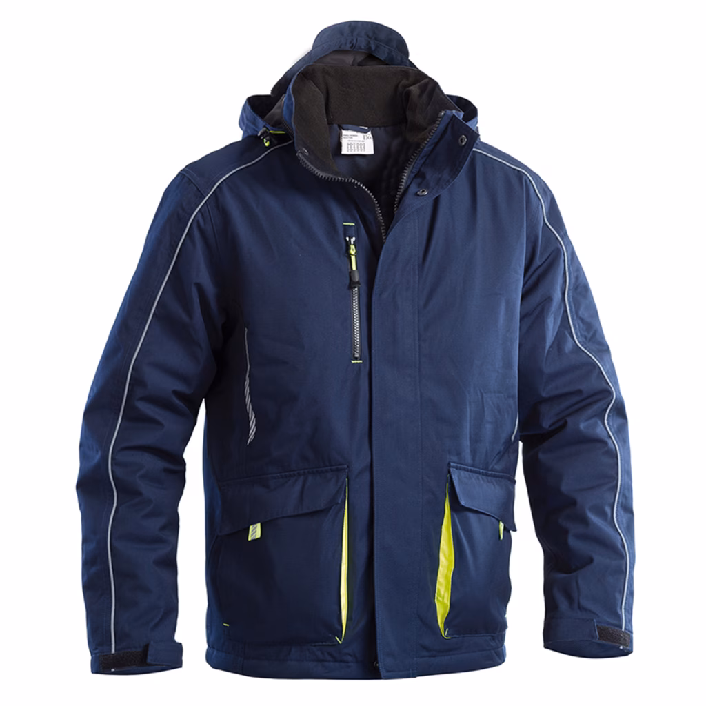 Parka con cappuccio inserito nel collo richiudibile con cerniera, cappuccio con doppio fermacorda giallo fluo per regolazione, tessuto impermeabile W/P 8000 mm e traspirante MVP 800 mm, tessuto tecnico interno collo, cuciture nastrate, piping rifrangente sulle maniche e sulla schiena, design rifrangente sui lati frontali, chiusura centrale con cerniera, finta copricerniera con bottoni a pressione, 2 tasche inferiori con soffietto giallo fluo chiuse con velcro e tirapattine giallo fluo rifrangente, tasche laterali scaldamani, 1 tasca interna chiusa con velcro, 1 tasca al petto chiusa con cerniera, polsini regolabili con velcro, tirazip colore giallo fluo, coulisse con doppio fermacorda giallo fluo per regolazione sul fondo.