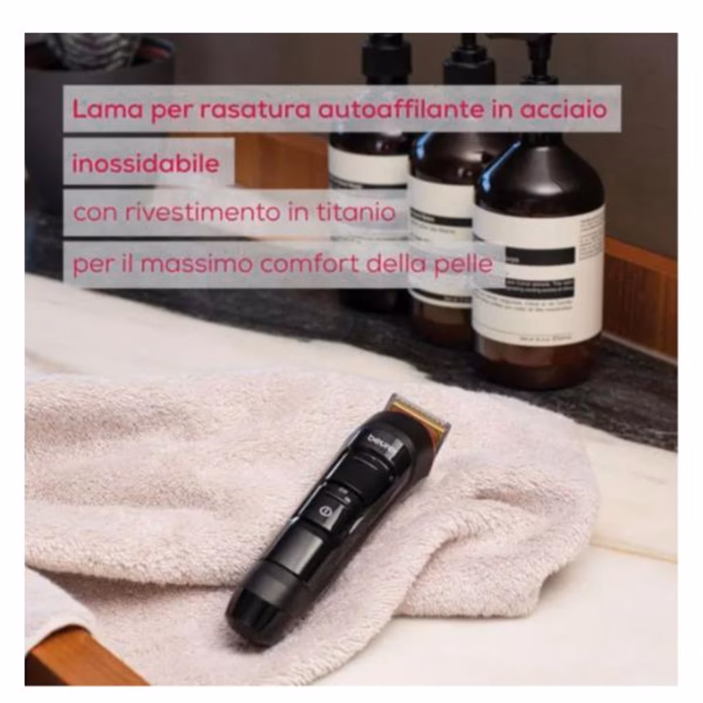 Regolabarba MN4XModellare la barba in tutta semplicità! Con il regolabarba MN4X di Beurer puoi regolare e radere la barba in base alle tue esigenze con estrema semplicità. Grazie a 10 lunghezze di taglio e alla regolazione fine a 2 livelli, tutti possono trovare la lunghezza adatta. Inoltre, puoi lavare facilmente il dispositivo e la testina per un utilizzo igienico.