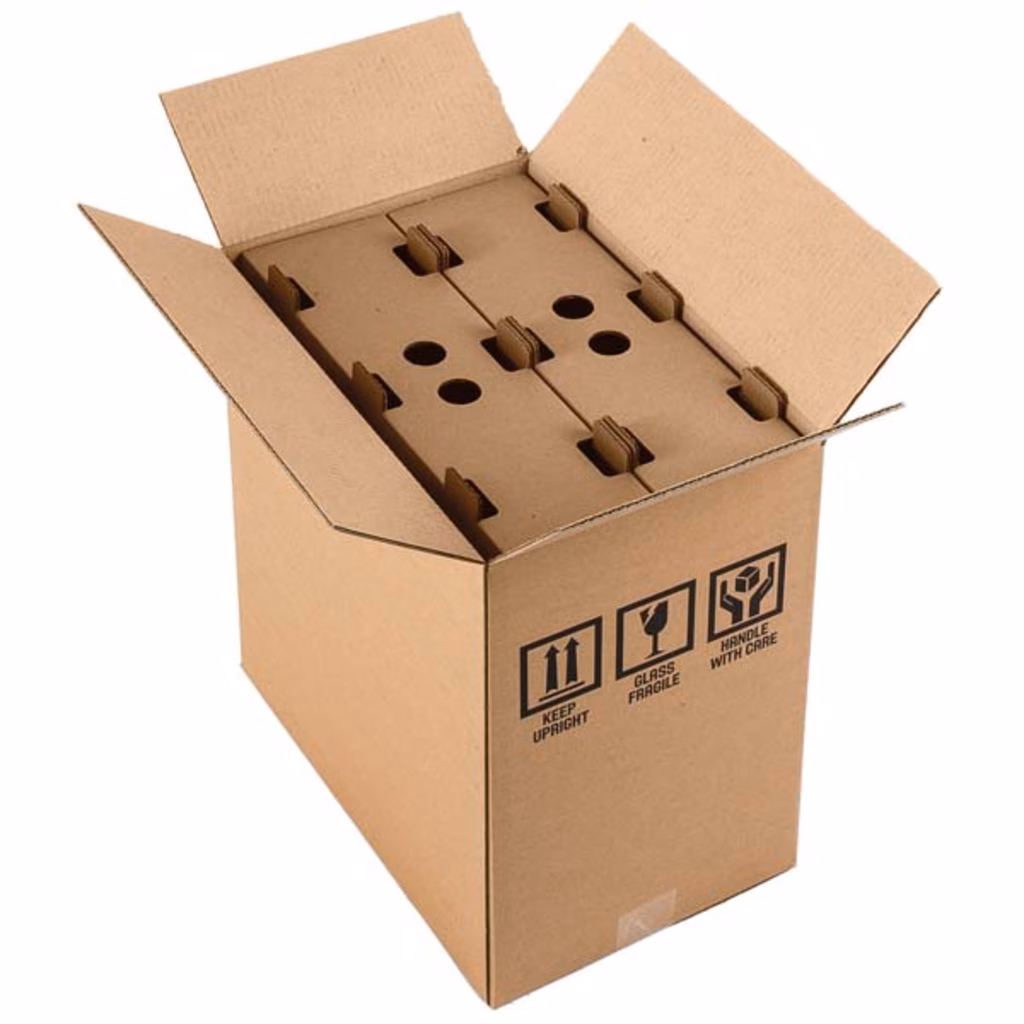 Robusta scatola a 2 onde con fustella interna per la spedizoine di bottiglie - ogni bottiglia viene inserita in 3 appoggi verticali che bloccano e proteggono dagli urti - per bottiglie standard da 37,5 cl a 75 cl - omologate dai corrieri BRT, GLS, TNT, UPS e POSTE ITALIANE