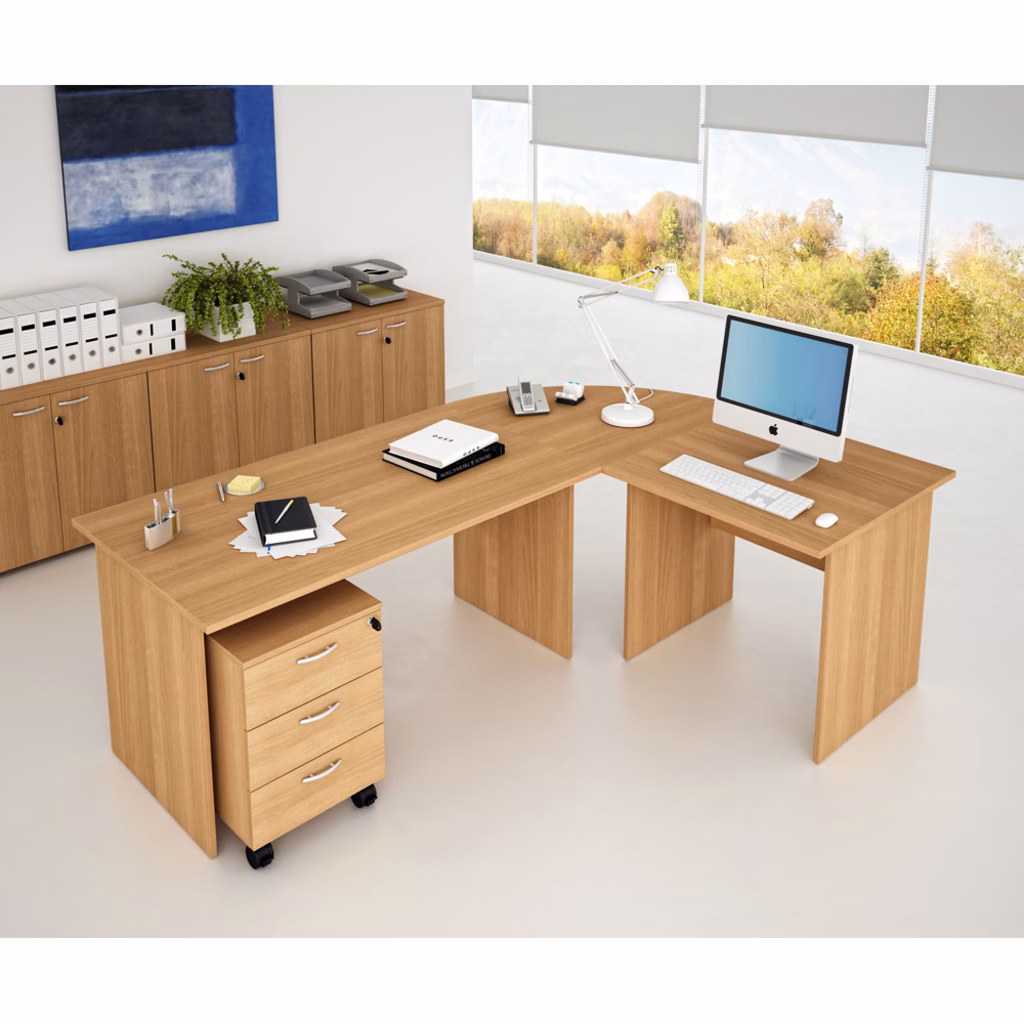 Piano scrivania in spessore 2,2 cm. Materiale in melaminico con finitura antigraffio e antiriflesso in classe E1. Bordature dei piani con abs in spessore, con assenza di spigoli vivi. Gambe a pannello.