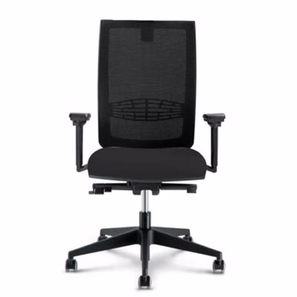 Schienale in rete colore nero - Meccanismo syncron autopesante multiblocco - Portata 150 kg - Poggiatesta opzionale - Regolazione in profondità del sedile - Supporto lombare regolabile in altezza integrato nello schienale - Base a 5 razze in nylon nera - Ruote gommate autofrenanti - Braccioli regolabili 3D (altezza, profondità ed orientamento) - Versione con sedile in tessuto ignifugo Mirage - Certificata UNI EN 1335 in classe "B" - Certificata CAM - Garanzia 5 Anni