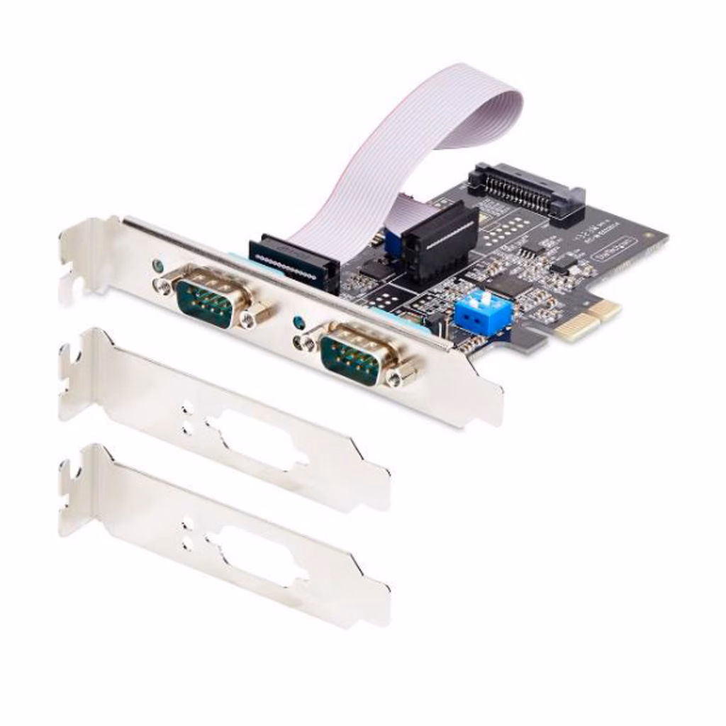 Scheda seriale PCIE a 2 porte: Gli interruttori DIP integrati consentono a ciascuna porta DB9 di operare in modalità indipendente permettendo di collegare dispositivi RS-232, RS-422 e RS-485. Indicatori LED per lo stato di trasmissione/ricezione dei dati.                                                                                      Alimentazione: La scheda adattatore seriale PCI Express a due porte è dotata di alimentazione configurabile (tramite jumpers) a 12V (1.5 A per porta) , 5V (1,5 A per porta) o nessun alimentazione (RI) sul pin 9 tramite l'alimentazione SATA ausiliaria.                                                                            Applicazioni: Per desktop e server, con un'ampia gamma di utilizzi come terminali per punti vendita, PLC, controllo e automazione di fabbrica, sensori scientifici, apparecchiature mediche, scanner e e oscilloscopi . Le porte DB9 funzionano con cavi a vite.                                                                        Staffe standard e a basso profilo: La scheda seriale conforme a TAA è dotata di due staffe a profilo standard (preinstallate) e include due staffe a basso profilo per la compatibilità con desktop/server con fattore di forma ridotto.                                                                                                                  Specifiche: Chipset Asix AX99100. Compatibile con 16C450 e 16C550 UART. 2 porte D-Sub a 9 pin. Baud massimo 921,6 Kbps/porta. 256 Byte FIFO. Ritenzione COM. Compatibile con Windows Windows Server e Linux. Modalità di parità Pari/Dispari/Mark/Spazio/None. 5/6/7/8/9 bit dati. PCIe 2.0x1.