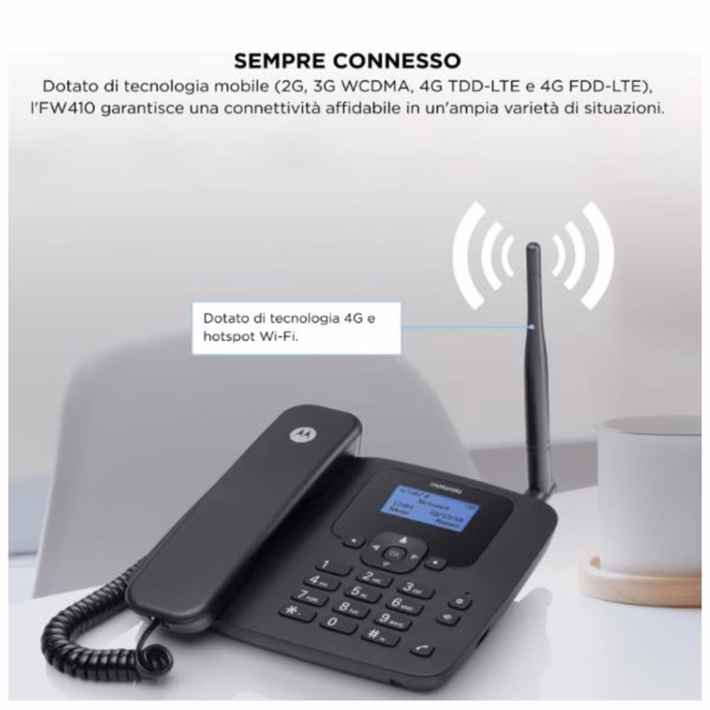 Il Telefono fisso Motorola FW410L 4G è un telefono da tavolo moderno con connettività mobile 4G, tramite una SIM (Nano-SIM), ideale per chi non ha la tradizionale linea telefonica fissa o per chi vuole un dispositivo con funzionalità avanzate di comunicazione via rete mobile.