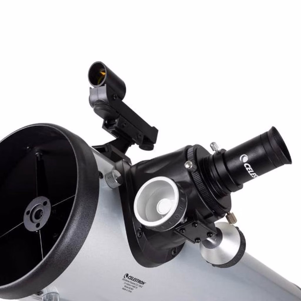 La dotazione dello strumento include oltre alla montatura e al treppiede regolabile con vassoio porta accessori anche il tubo ottico, due oculari, un cercatore a punto rosso e un diagonale ad immagine raddrizzata.
