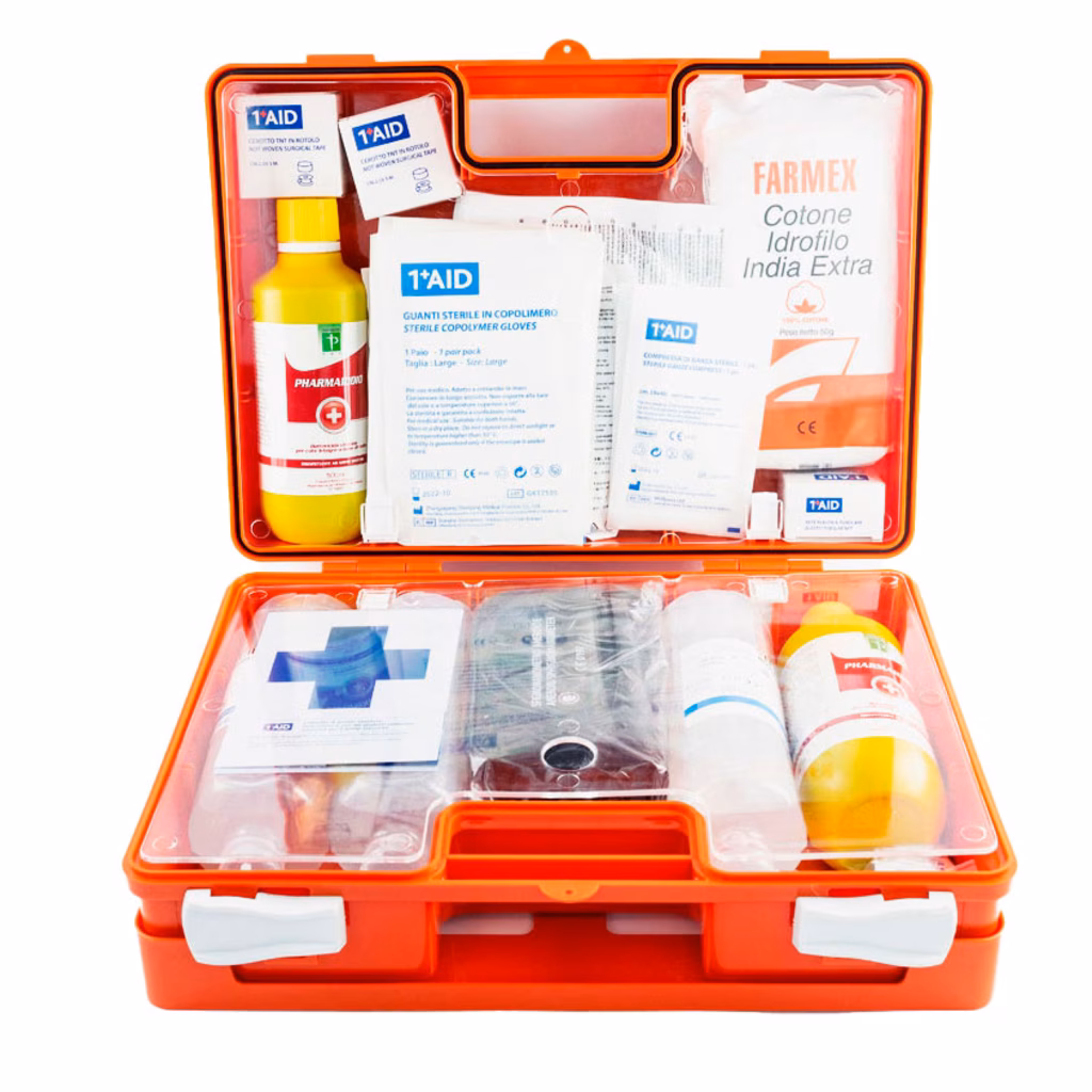 Valigetta in ABS antiurto a doppio scomparto. Contenuto secondo All. 1 del D.lgs. 81/2008-D.M.388/2003 per aziende del gruppo AB con più di tre lavoratori, CON MAGGIORAZIONE. Contenuto: 1 copia Decreto Legislativo n° 81/ 2008 - istruzioni per l'uso dei presidi contenuti e per le prestazioni dei primi soccorsi in attesa dei servizi d'emergenza - 1000 ml di soluzione cutanea di iodopovidone al 10% iodio (2 flaconi) - 1500 ml di soluzione fisiologica (sodio cloruro - 0,9%) (3 flaconi) - 5 paia di guanti sterili monouso - 1 mascherina con visiera paraschizzi - 10 compresse di garza sterile cm 10X10 in buste singole - 2 compresse di garza sterile cm 18×40 in buste singole - 2 teli monouso cm 40×60 - 2 pinzette da medicazione sterili monouso - 1 garza orlata cm 10x 4 m - 1 coperta isotermica - 2 tampobende sterili cm 80×100 - 1 telo triangolare - 3 bustine sapone ml 3 - 3 bustine disinfettante - 2 bustine ammoniaca - 2 gel antiscottatura - 1 confezione cotone idrofilo - 1 confezione di rete elastica di misura media - 2 confezioni da 10 cerotti di varie misure pronti all'uso - 2 rotoli di cerotto alti cm 2,5x 5 m - 1 paio di forbici - 3 lacci emostatici - 2 confezioni di ghiaccio pronto uso - 2 sacchetti monouso per la raccolta di rifiuti sanitari - 1 termometro clinico digitale - 1 apparecchio per la misurazione della pressione arteriosa