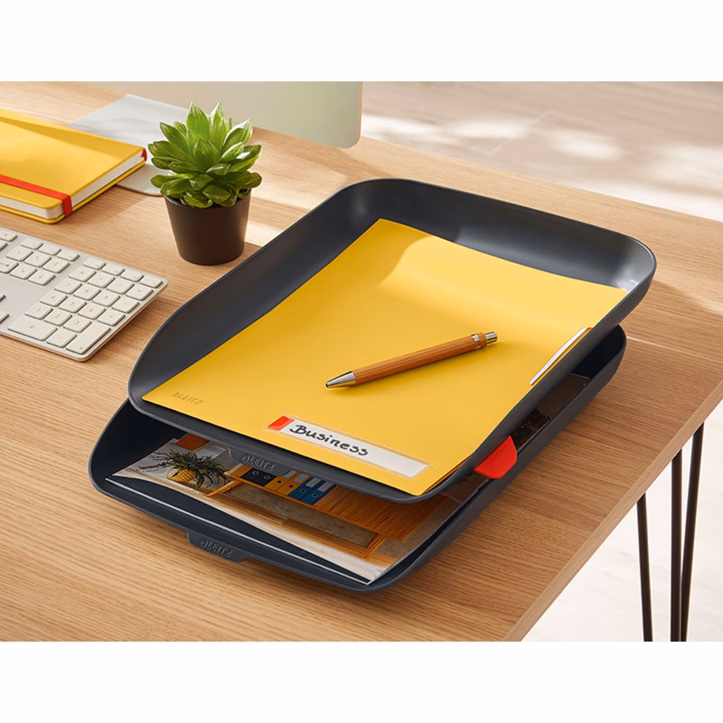 Set di 2 vaschette portacorrispondenza A4 premium con distanziatore rosso. Adatte per archiviare documenti, riviste e fascicoli di formato fino all' A4 e C4. L'ampia apertura frontale garantisce un facile accesso ai contenuti anche se impilati. Imballaggio senza plastica.